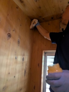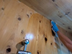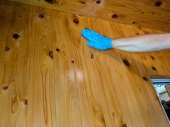 洗浄後に「抗菌剤入り密ロウワックス」(市販の密ロウワックスに有用微生物由来の抗カビ剤を添加したもの)を檜面に塗布します。